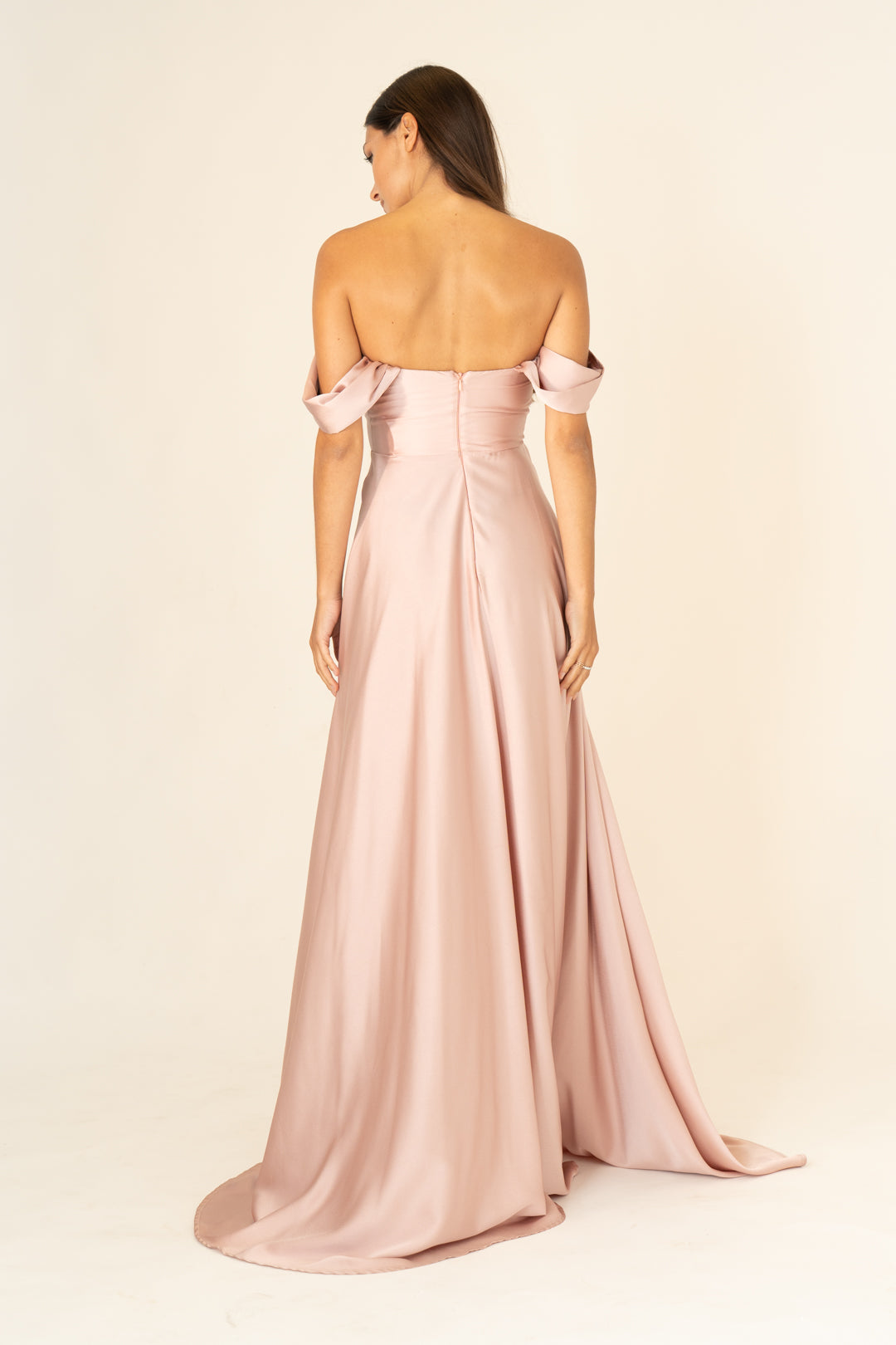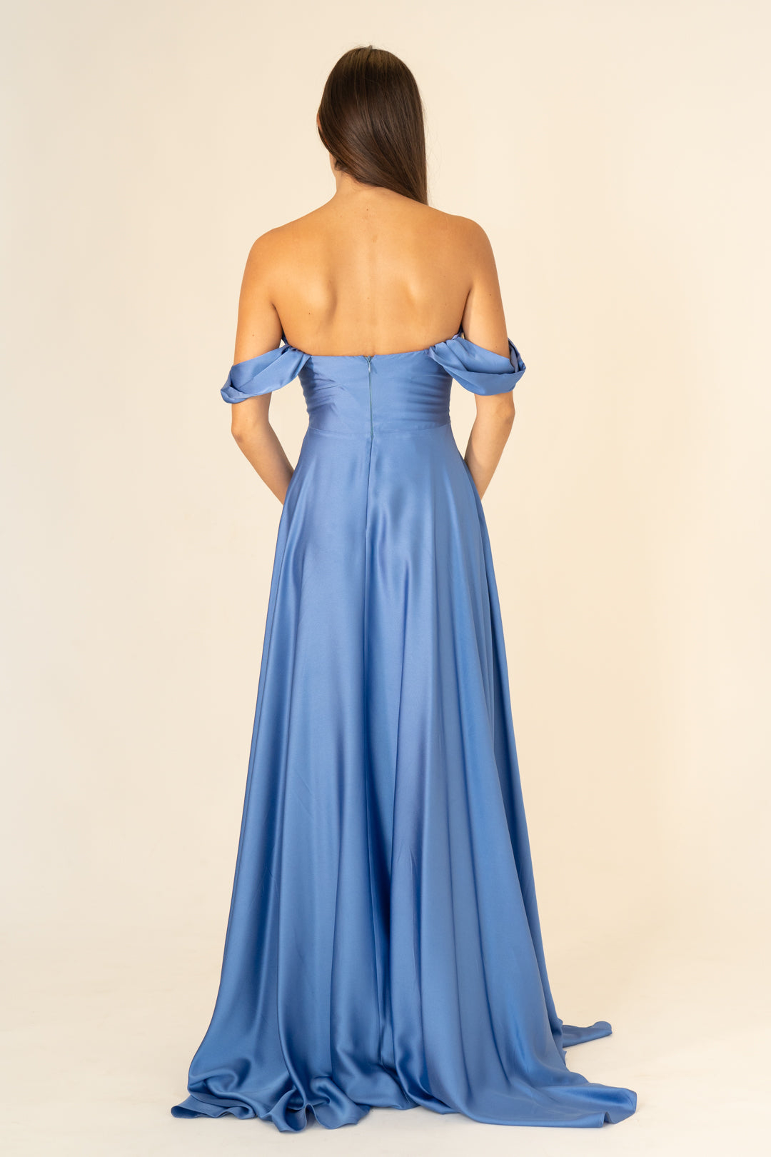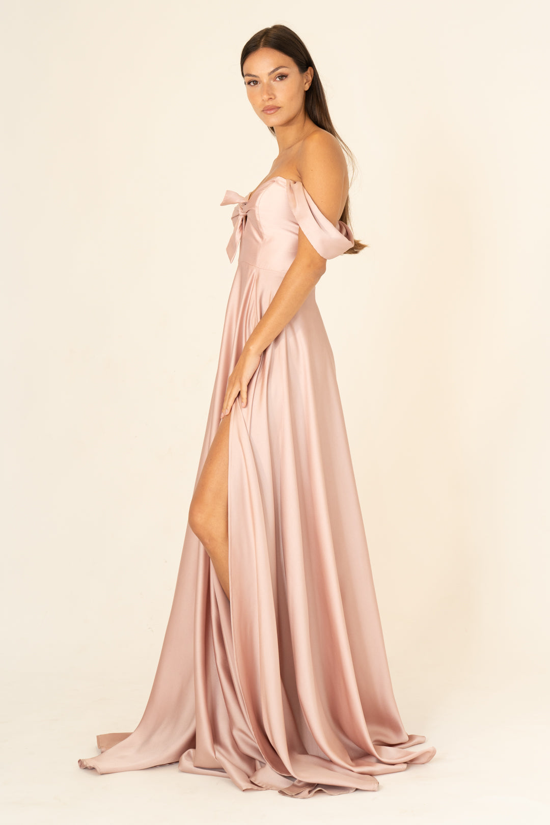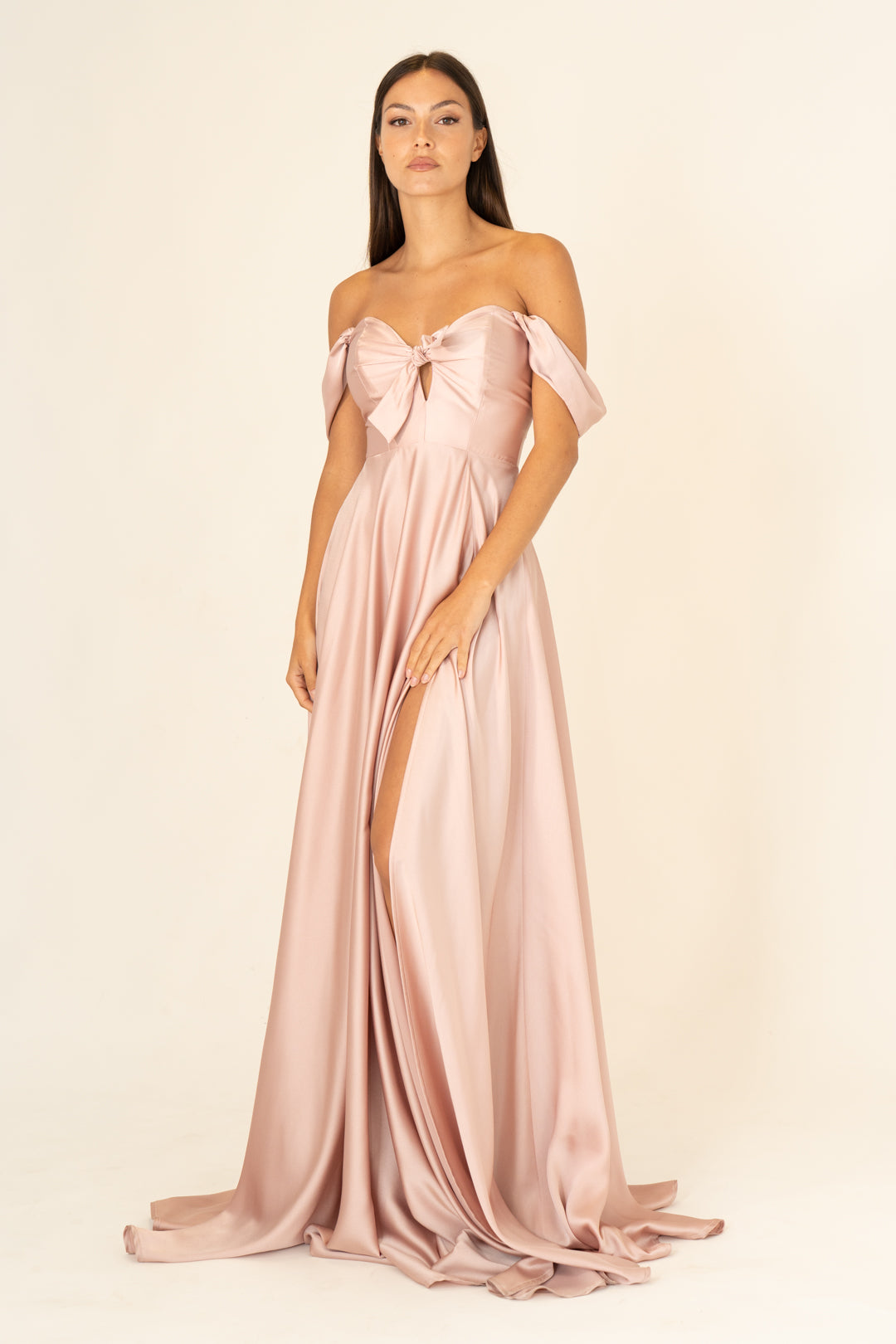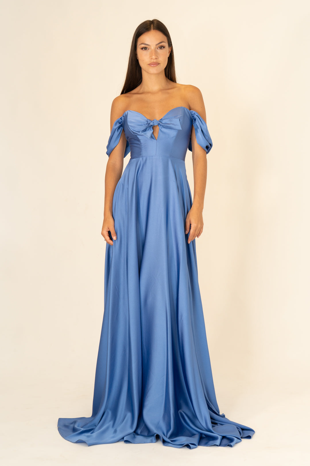 Abito lungo elegante romantico dalla scollatura a cuore legata da un fiocchetto e maniche morbide sulla spalle, con gonna ampia lunga fino al fondo e spacco laterale destro